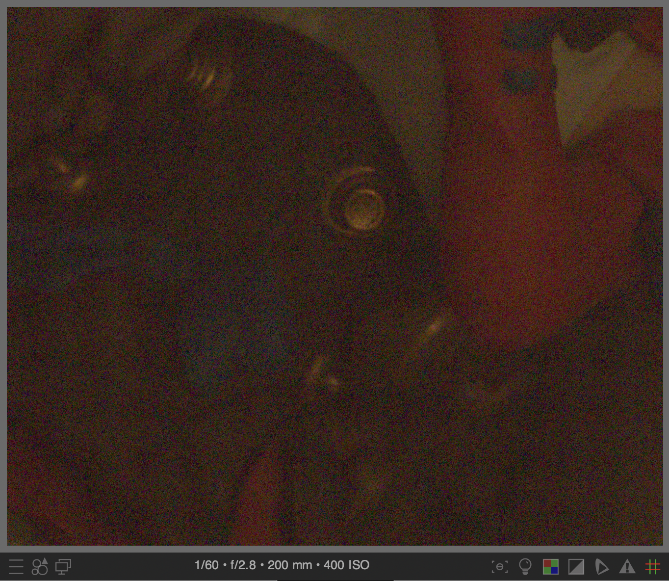 This bears out in practice. I took a series of images in low light with the same aperture and shutter speed, changing only the ISO. Each image was then digitally processed in darktable with exposure compensation so images are of the same brightness (i.e. 1 extra step of exposure for each reduction in ISO):
