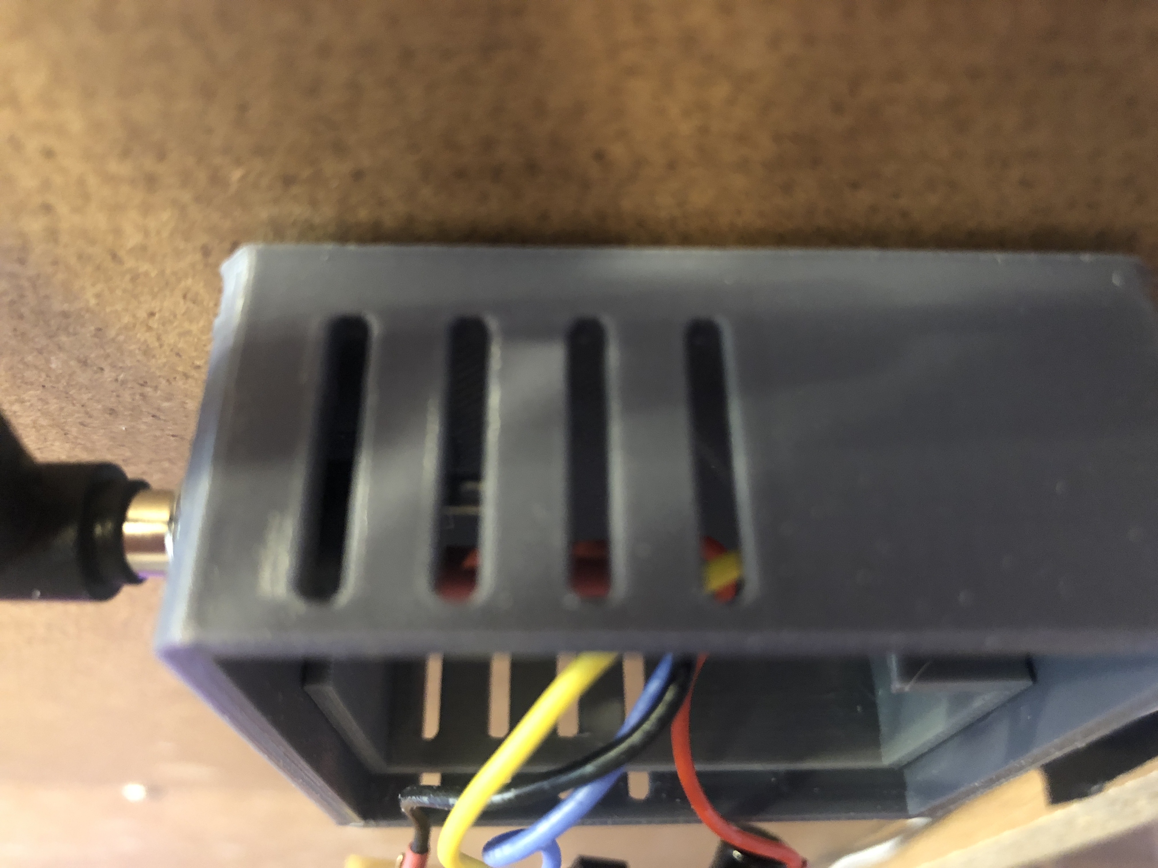 The initial case design had the vents (seen below) built in to reduce printing time, turns out they are also very useful for passive cooling of the NPN transistor.
