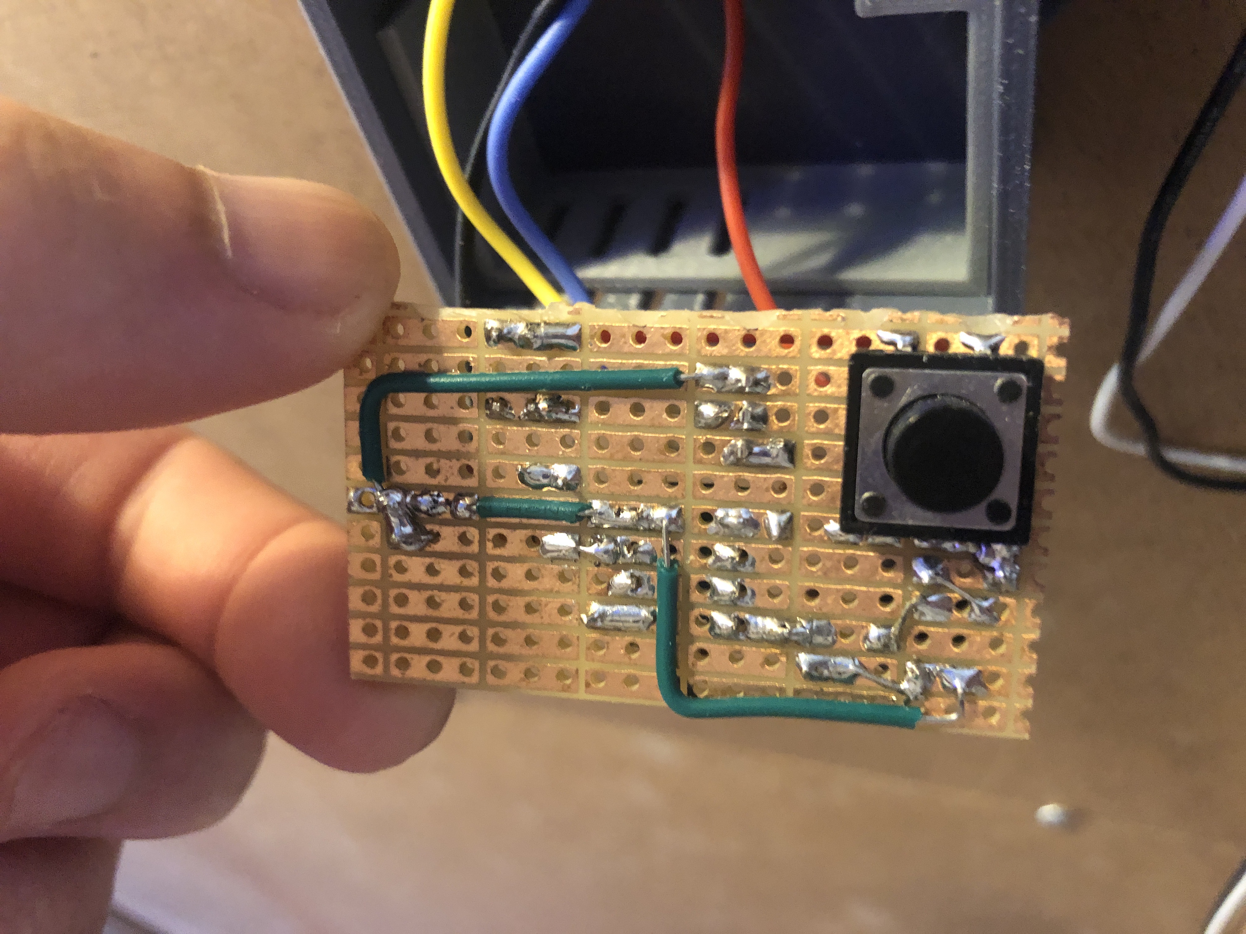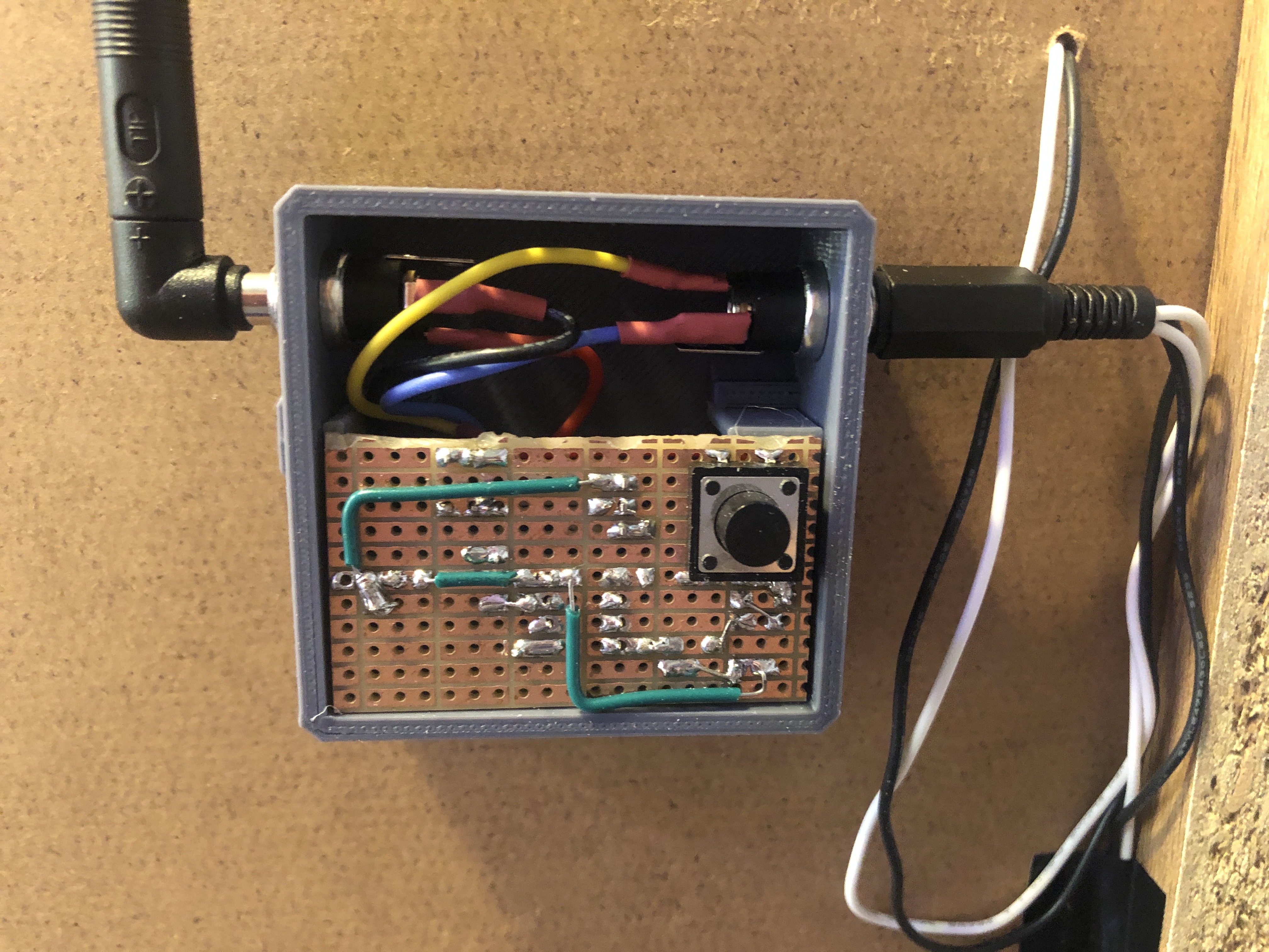 This project was an opportunity to try a new way of encapsulating projects, namely by using PCB spacer to raise the strip board to top of the enclosure and then constructing a lid to match the button's position. This worked quite well, especially here where the NPN transistor needed some room to dissipate heat. The spacer can be seen in the following photo. Note the vents built into it which line up with the case vents.