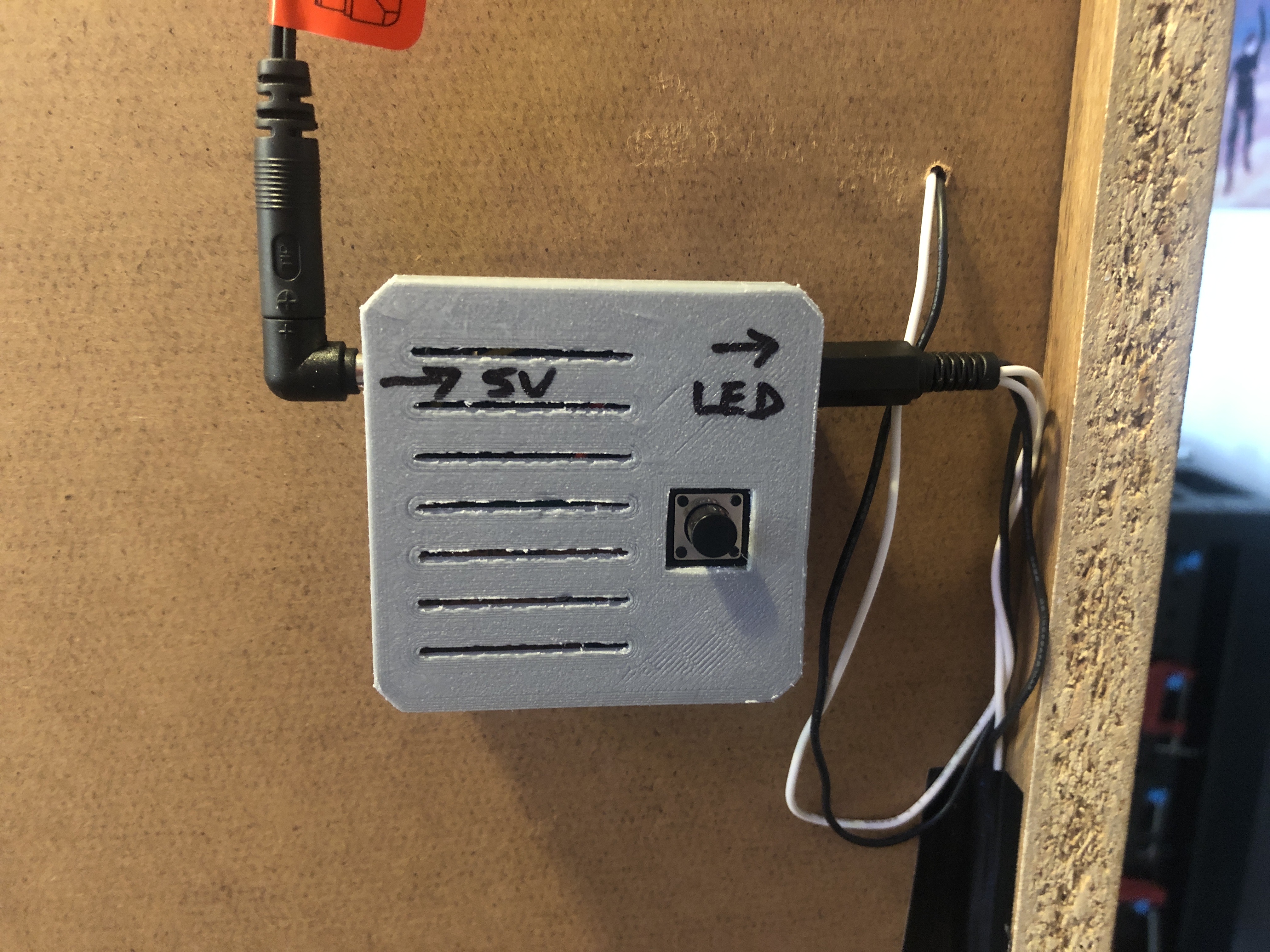 Finished product first, this is the controller mounted on the back of the bookcase where the LED strips are mounted. 5V from a wall plug PSU enters on the left and the LEDs strips are wired in parallel on the right. The single button cycles between on and 3 levels of brightness, with max brightness consuming around 800mA.